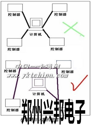 控制器通訊線(包括485/422、232和韋根等通訊線)必須采用國際通用的8芯屏蔽雙絞線,這樣可有效防止和屏蔽干擾。線徑大于0.3mm總線長度不超過1200建議在1000米以內,如果更長請選用其它專用485/232轉換器或者加中繼器,并選用更粗的通訊電纜??刂破鱃ND 485- 485+分別對應連接485轉換器GND TD(A) TD(B),通訊線路采用串聯(lián)掛接式連接,請勿采用星型連接或者局部星型連接(如圖)。