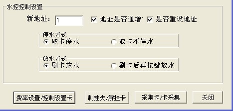 2 水控控制設(shè)置:新地址設(shè)置為1,把地址號(hào)是否遞增和是否重設(shè)機(jī)器號(hào)前面的選項(xiàng)選上,如下圖所示,點(diǎn)擊費(fèi)率設(shè)置|控制設(shè)置卡按鈕,點(diǎn)擊控制設(shè)置卡, 即可成功制作成控制設(shè)置卡去修改聯(lián)網(wǎng)型水控一體機(jī)的機(jī)器號(hào)。控制設(shè)置卡在機(jī)器上數(shù)卡成功時(shí)會(huì)提示8 OK 9 OK 10 OK