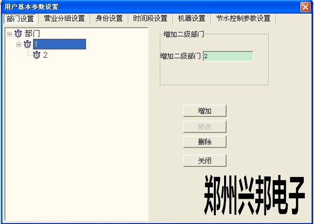 打開485售飯機軟件--系統(tǒng)管理--用戶參數(shù)設(shè)置--用戶基本參數(shù)設(shè)置--部門,打開后點擊部門,可以添加一級部門,然后再把光標(biāo)點到一級部門上,此時可以添加二級部門,如下圖所示