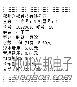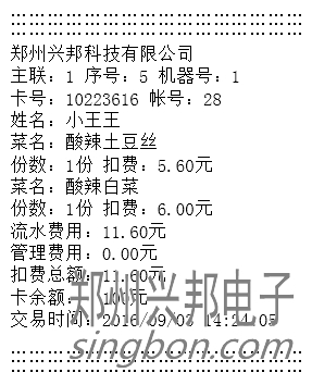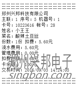 3) 自動消費模式:最多可設置8個費率,每個費率可設置對應的菜肴、份數(shù),將費率設置好之后在自動模式下輸入相應的費率編號放卡即可自動扣除相應費用。只有計算和自動模式可以用,計算模式只作為查看使用,不能扣費。若連接的有打印機,可打印消費明細,打印出來的消費明細格式如下圖所示: