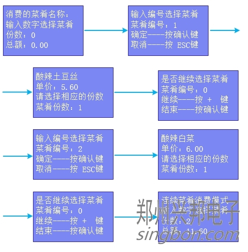 ③ 連續(xù)菜肴消費模式:輸入菜肴編號,點擊確認后選擇份數(shù),點擊確認后出現(xiàn)“是否繼續(xù)選擇菜肴,菜肴編號:0,繼續(xù)----按 +  鍵,結束----按確認鍵”,點擊“+”號,輸入下一份菜肴編號,點擊確認后選擇份數(shù),點擊確認后出現(xiàn)是“是否繼續(xù)選擇菜肴,菜肴編號:0,繼續(xù)----按 +  鍵,結束----按確認鍵”,點擊確認,出現(xiàn)消費的份數(shù)、總額,將卡片放于刷卡區(qū),即可進行扣費,扣費后顯示扣費金額、手續(xù)費用、卡上余額、卡號,操作流程如下圖所示:
