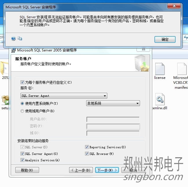 客戶使用的我們的局域網(wǎng)一卡通食堂售飯機,在安裝SQL Server2005時提示安裝程序無法驗證服務帳戶。這是怎么回事呢?