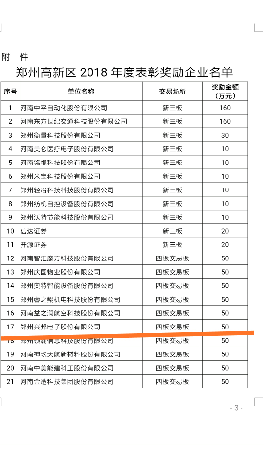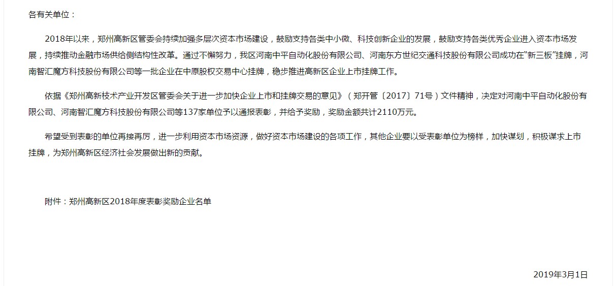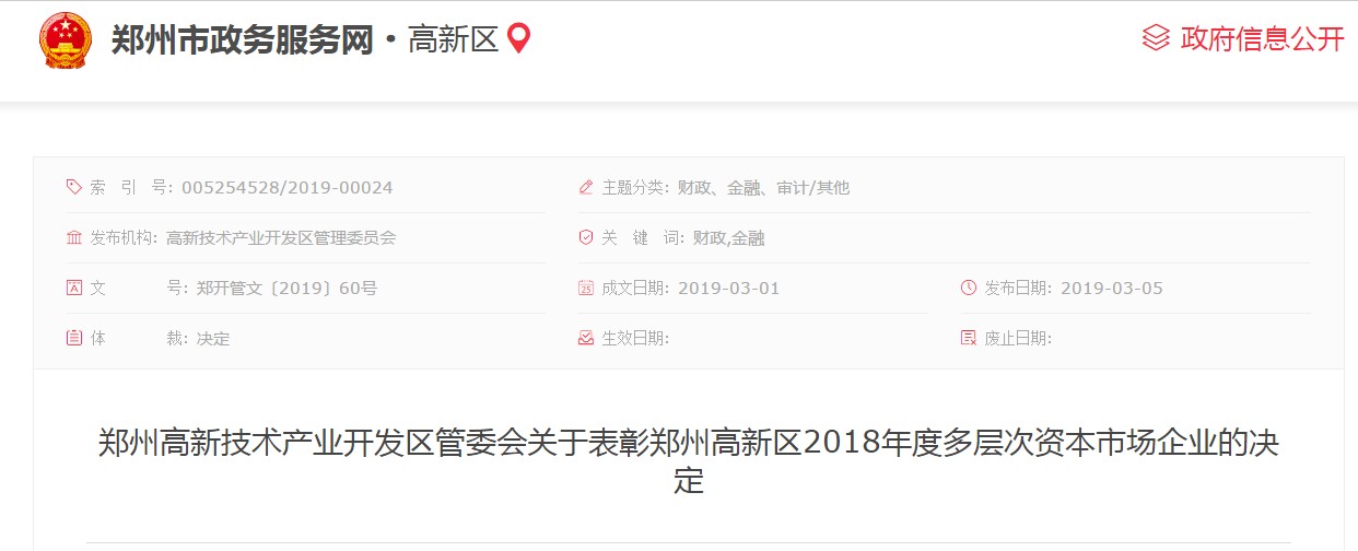 轉(zhuǎn)發(fā):鄭州高新技術(shù)產(chǎn)業(yè)開發(fā)區(qū)管委會關(guān)于表彰鄭州高新區(qū)2018年度多層次資本市場企業(yè)的決定