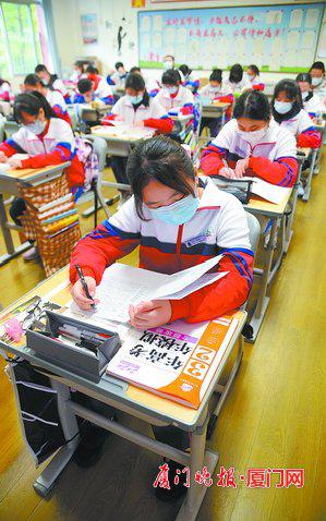 廈門網(wǎng)訊(廈門晚報記者郭文娟林珊吳笛圖/劉東華)今天早上,全市近1.6萬名高三學(xué)生重返課堂。距離高考只有三個月了,老師勉勵學(xué)子們:“寧吃百日苦,不留終生憾!”校園里張貼的紅色標(biāo)語,也為學(xué)生們加油鼓勁:“努力到無能為力,拼搏到感動自己!”